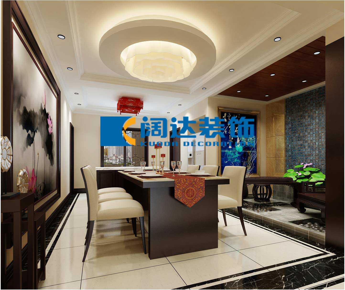 空間上講究層次,多用隔窗、屏風(fēng)來分割,用實木做出結(jié)實的框架,以固定支架,中間用欞子雕花,做成古樸的圖案。門窗對確定中式風(fēng)格很重要,用實木雕刻,打磨光滑,富有立體感??蛷d是傳統(tǒng)與現(xiàn)代居室風(fēng)格的碰撞,