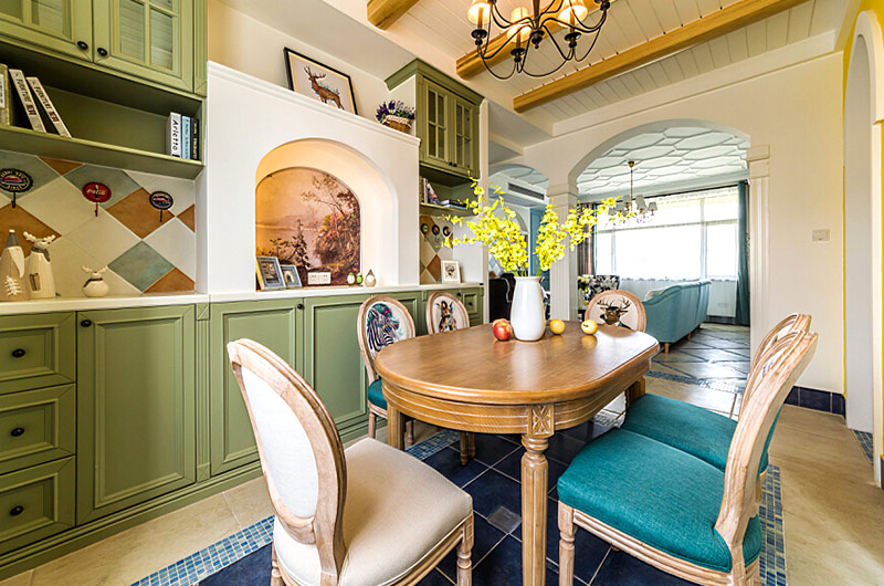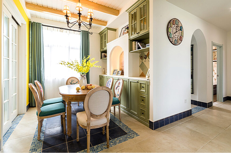 本案中的130平米的三居室整體采用了地中海風(fēng)格裝修,并在清爽愜意的空間氛圍中融入了田園風(fēng)格的清新自然感,在色彩的選擇上也盡量的以清爽的藍(lán)色和富有活力的明黃色為主,并在餐廳中運(yùn)用了象征著森林的墨綠色,為空間帶來(lái)靜謐之感的同時(shí)也增添了幾分自然的氣息。同風(fēng)格案例:更多>>