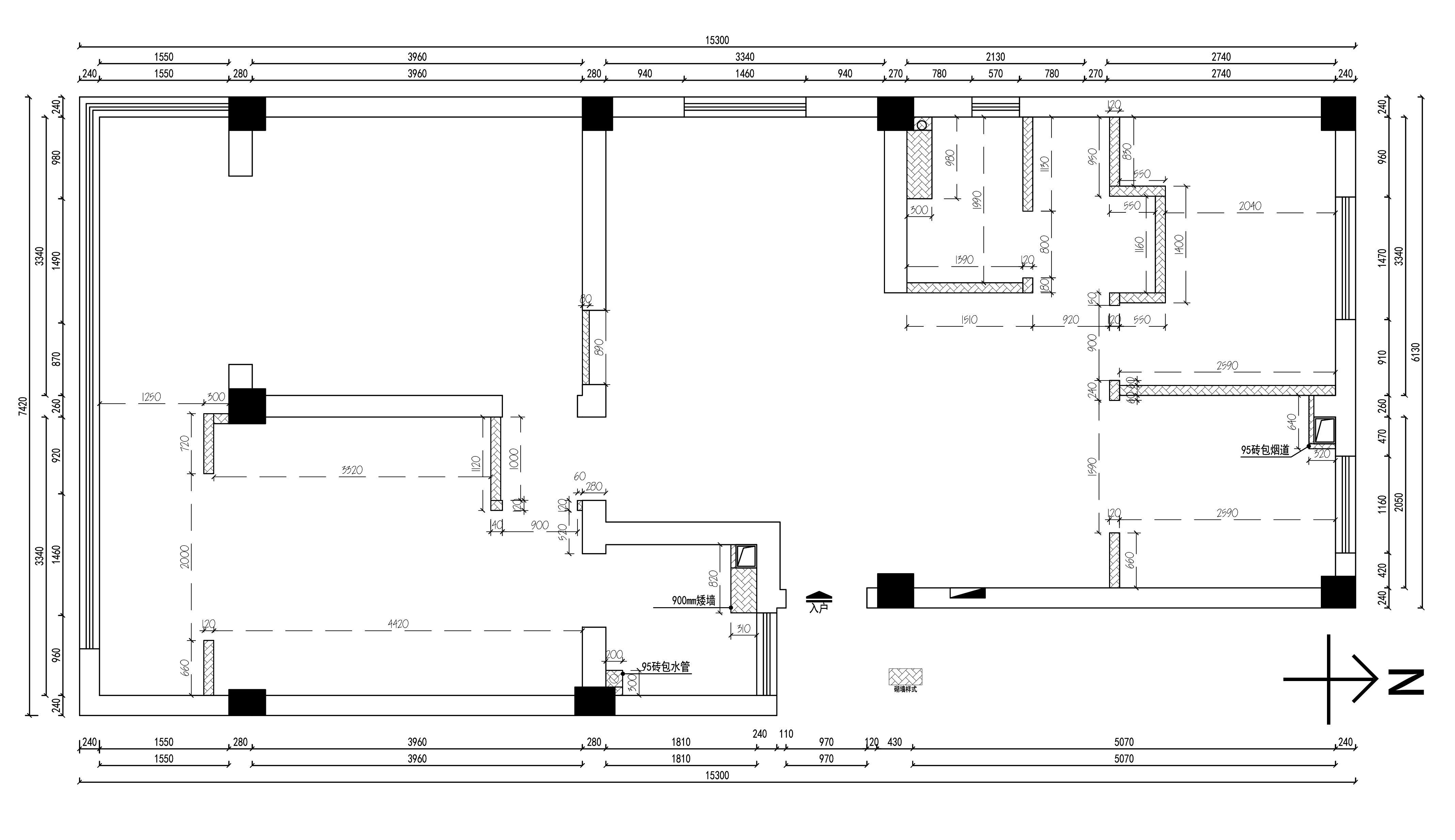3、將北側(cè)臥室與廚房的墻,整體向內(nèi)移動(dòng),與擴(kuò)大后衛(wèi)生間門墻對(duì)齊