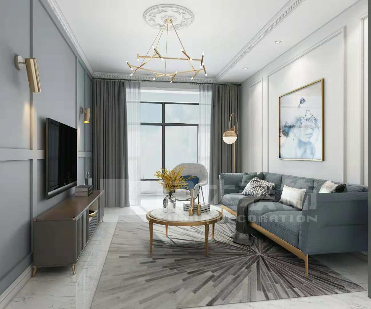 通過(guò)改變臥室門方向,延長(zhǎng)了客廳墻面,正好將沙發(fā)由南朝北放置于此,對(duì)面電視背景做懸空處理,將光線引入餐廳,整個(gè)區(qū)域采光、動(dòng)線和比例較為適宜。