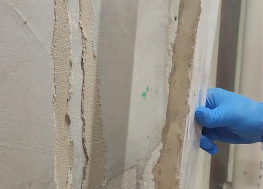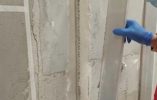 先把攪拌好的材料刮到靠尺上,然后用抹刀將兩邊多余的材料收平,將筋條取掉我們可以看到,石膏未與基層粘結(jié),導(dǎo)致后續(xù)筋條空鼓。