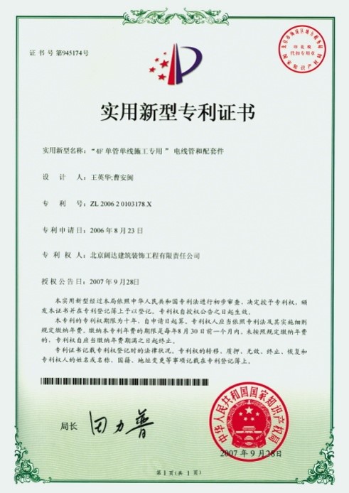 闊達4F單管單線擁有中華人民共和國知識產權局頒發(fā)的發(fā)明專利證書。