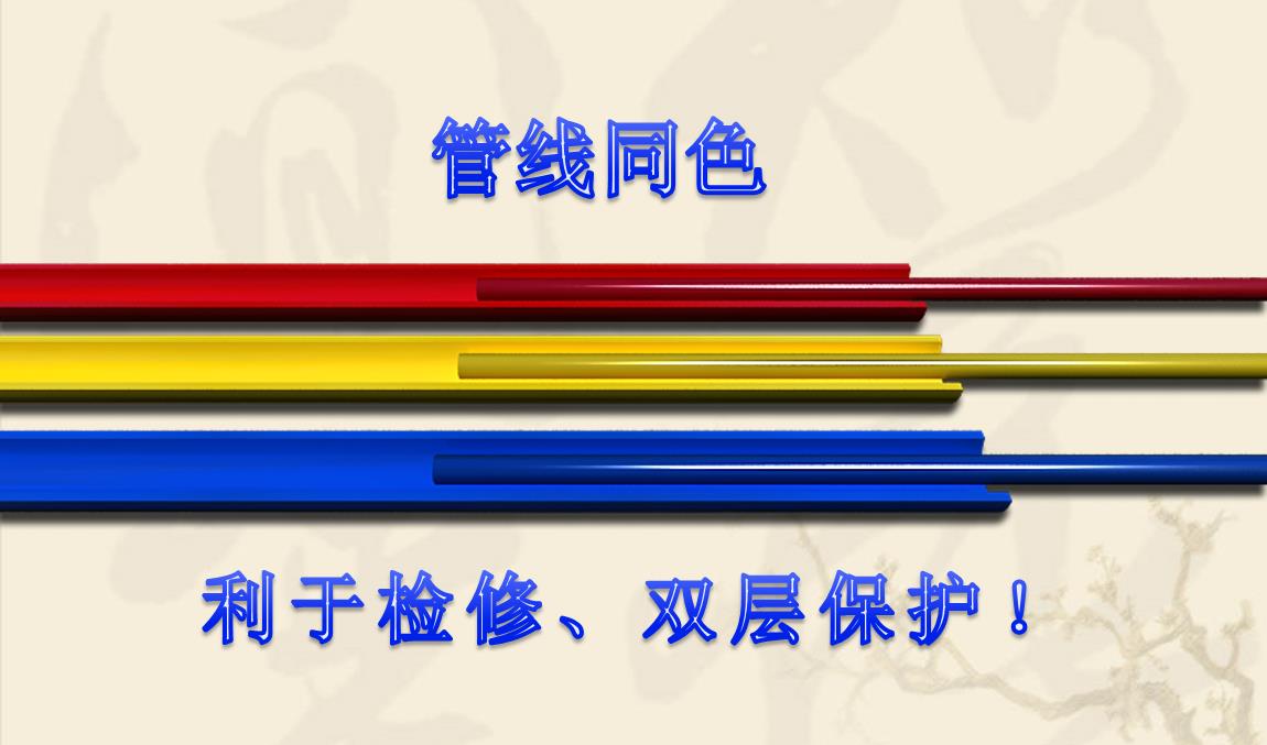 3. 線/管各分為四種顏色,對應相應電線,清楚區(qū)別火線、零線、地線、回路線,非專業(yè)人員也能識別并維修更換,實實在在保證施工與維修中不會發(fā)生接錯的現(xiàn)象,保證用電安全。