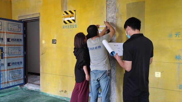 客戶、設計師、管家及水電師傅,現(xiàn)場確定水電位置,管家以文字加圖片形式發(fā)送至微信服務群,告知客戶今天交底的內(nèi)容,待客戶確認后方可施工。