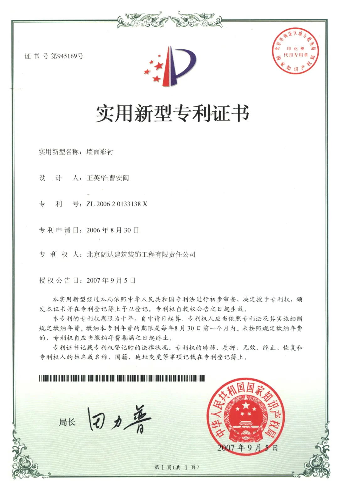 闊達墻面彩襯可是擁有中華人民共和國知識產(chǎn)權(quán)局頒發(fā)的實用新型專利證書的產(chǎn)品哦。