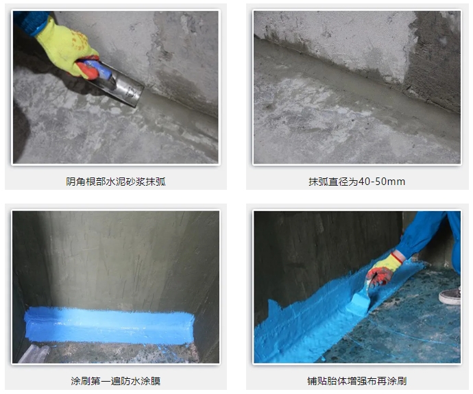 ①在陰角根部,用水泥砂漿進(jìn)行抹弧處理后再進(jìn)行防水涂刷。第一次涂刷防水涂層后,必須鋪貼胎體增強(qiáng)布,然后才可以進(jìn)行二次涂刷。這樣增加了防水涂層的致密性,提高了防水的使用年限。(下圖為操作示意圖)