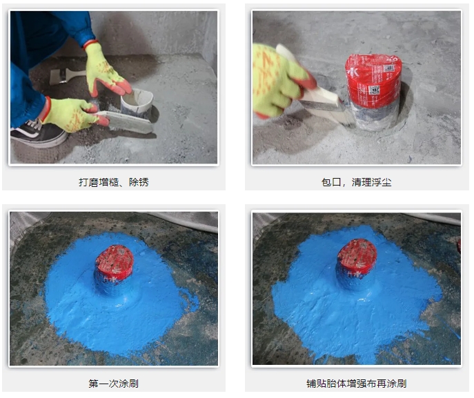 ②各下水管道根部與樓板搭接處,要在第一次涂刷防水涂料后鋪貼胎體增強(qiáng)布,而后才可以進(jìn)行二次涂刷。此時,需要特別注意,在涂刷前,管道(PVC/鐵管)要打磨增糙/除銹。若管根與樓板搭接處有松動及裂縫,需開槽密封后,方可按照上述工序進(jìn)行施工。