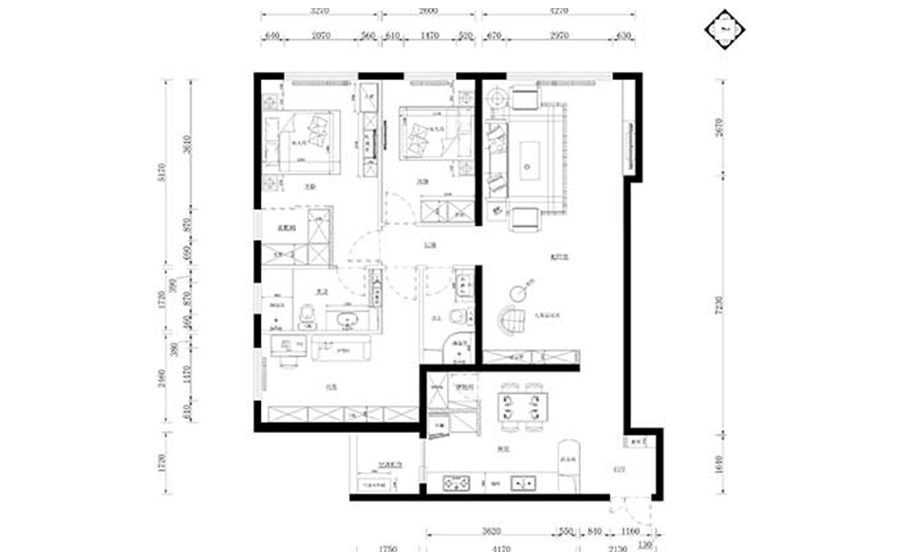 設(shè)計(jì)思路說(shuō)明此戶型為三口之家,兩位老人帶孩子,風(fēng)格定義為現(xiàn)代風(fēng)格。需要有孩子的活動(dòng)玩??臻g,所以把起居室分割為會(huì)客廳及活動(dòng)區(qū),而原有就餐區(qū)移到原廚房,做一開放式廚房餐廳于一體,獨(dú)立的門廳部位,這樣可以更好的區(qū)規(guī)劃。