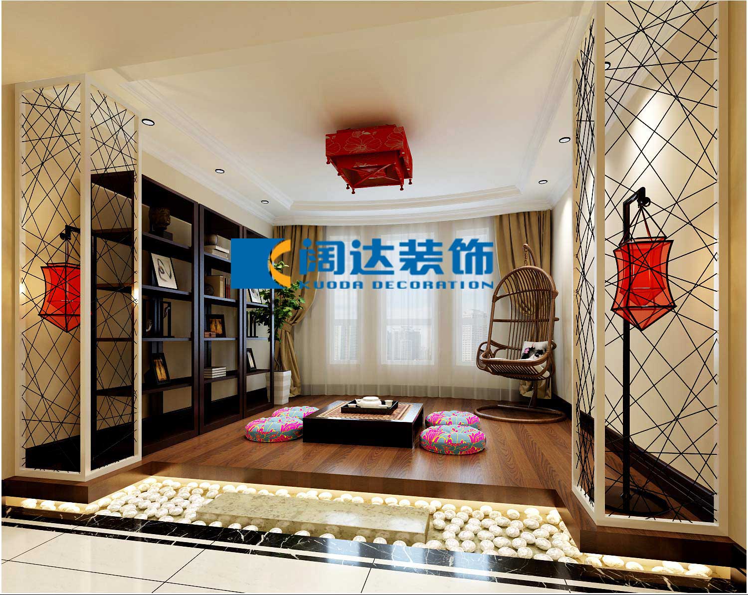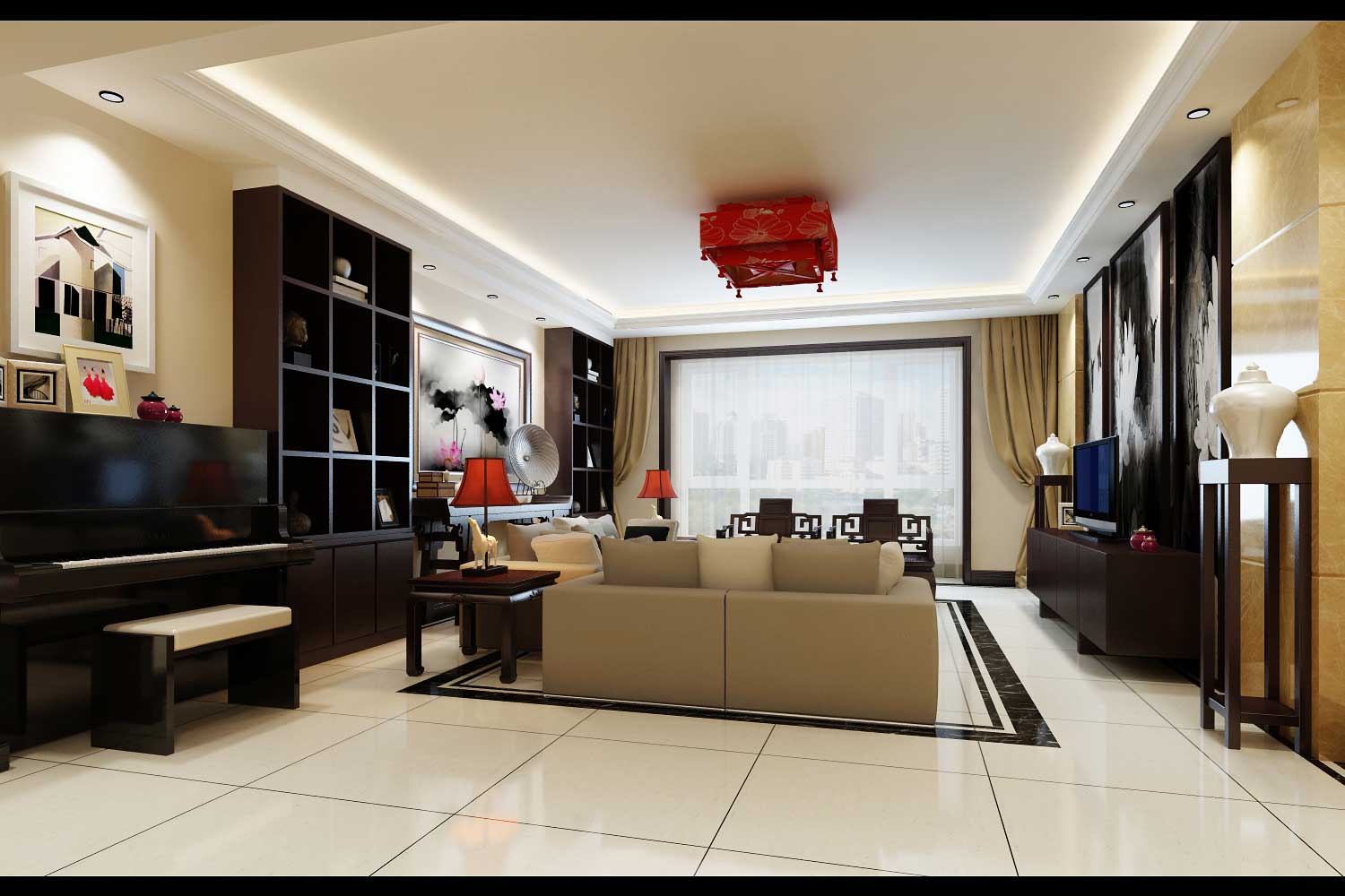 空間上講究層次,多用隔窗、屏風(fēng)來分割,用實木做出結(jié)實的框架,以固定支架,中間用欞子雕花,做成古樸的圖案。門窗對確定中式風(fēng)格很重要,用實木雕刻,打磨光滑,富有立體感??蛷d是傳統(tǒng)與現(xiàn)代居室風(fēng)格的碰撞,