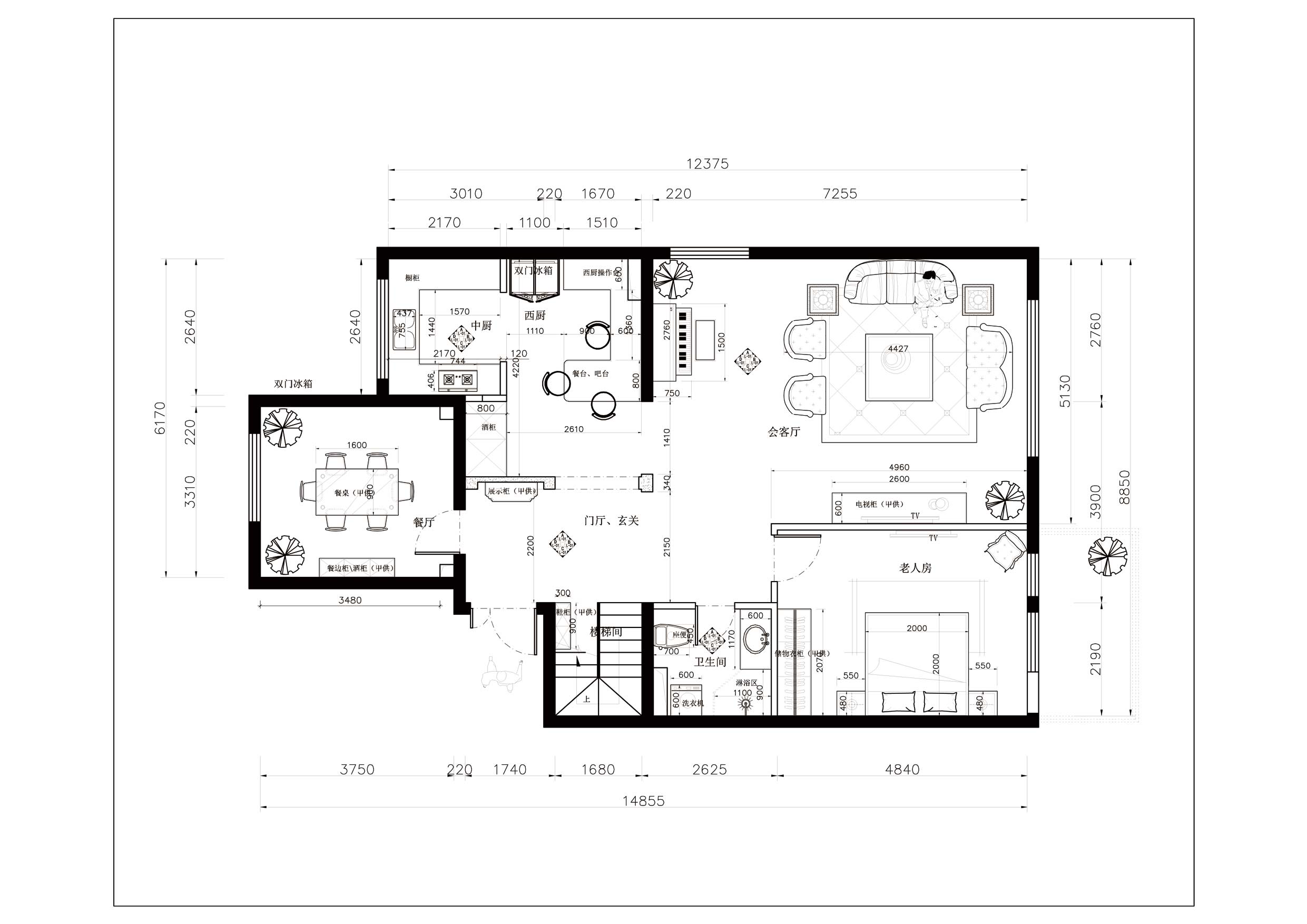 本案例業(yè)主是事業(yè)有成的一家三口,小區(qū)環(huán)境十分優(yōu)美,緊鄰百望山,戶型空間十分敞亮、明快。但此戶型擺在我面前的最大問題是入戶門廳太大,空間浪費明顯、及臥室房間不夠用等。因此在設計上首先要解決空間布局的問題,首先增加門廳玄關位置,擴大中西廚面積,其次在一樓增加老人房解決房間較少的問題。