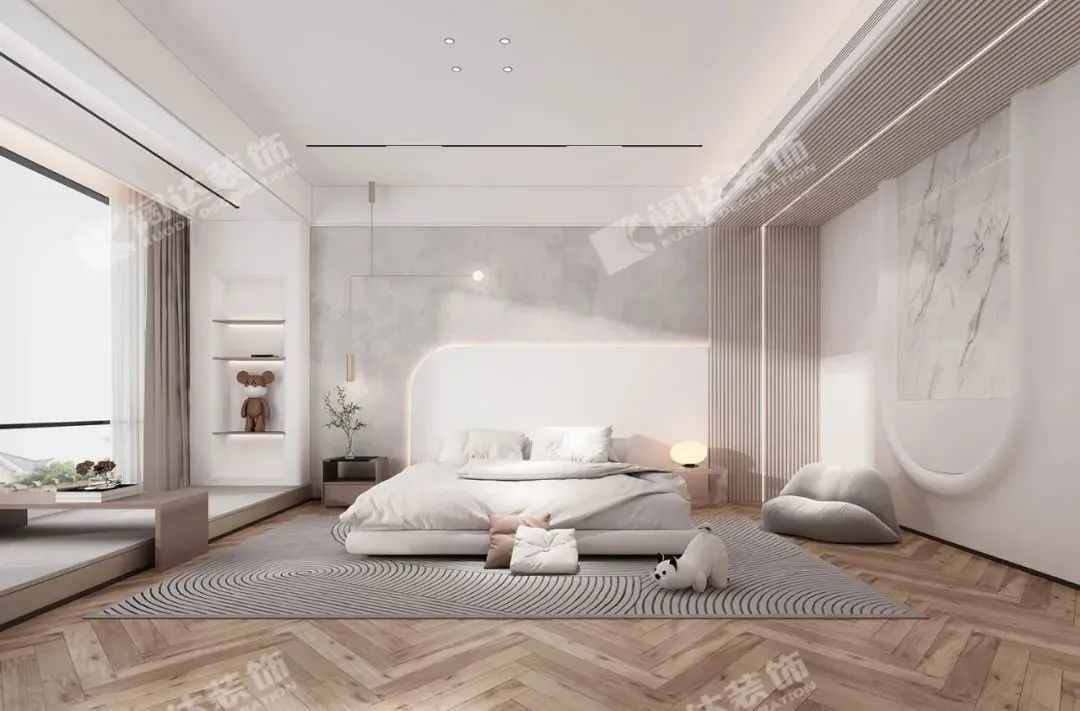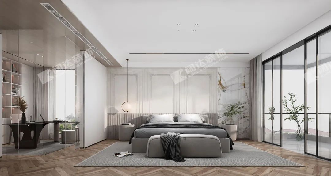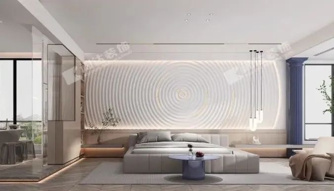 主臥整體空間由低飽和度的顏色組成,背景墻的軟包柔軟細(xì)膩,予人冷靜安謐的視覺感受。