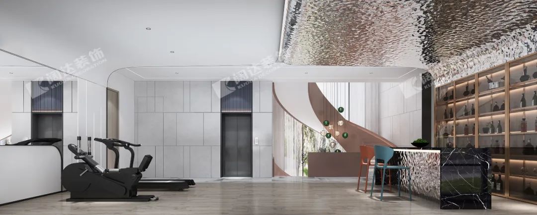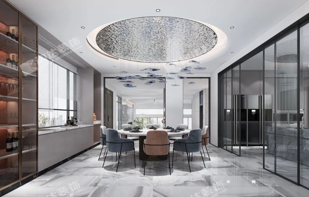 淺色系的餐廳搭配深色系的家具軟裝,金屬吊頂和水晶燈的搭配,整個(gè)餐廳給人一種優(yōu)雅、輕奢的感覺。
