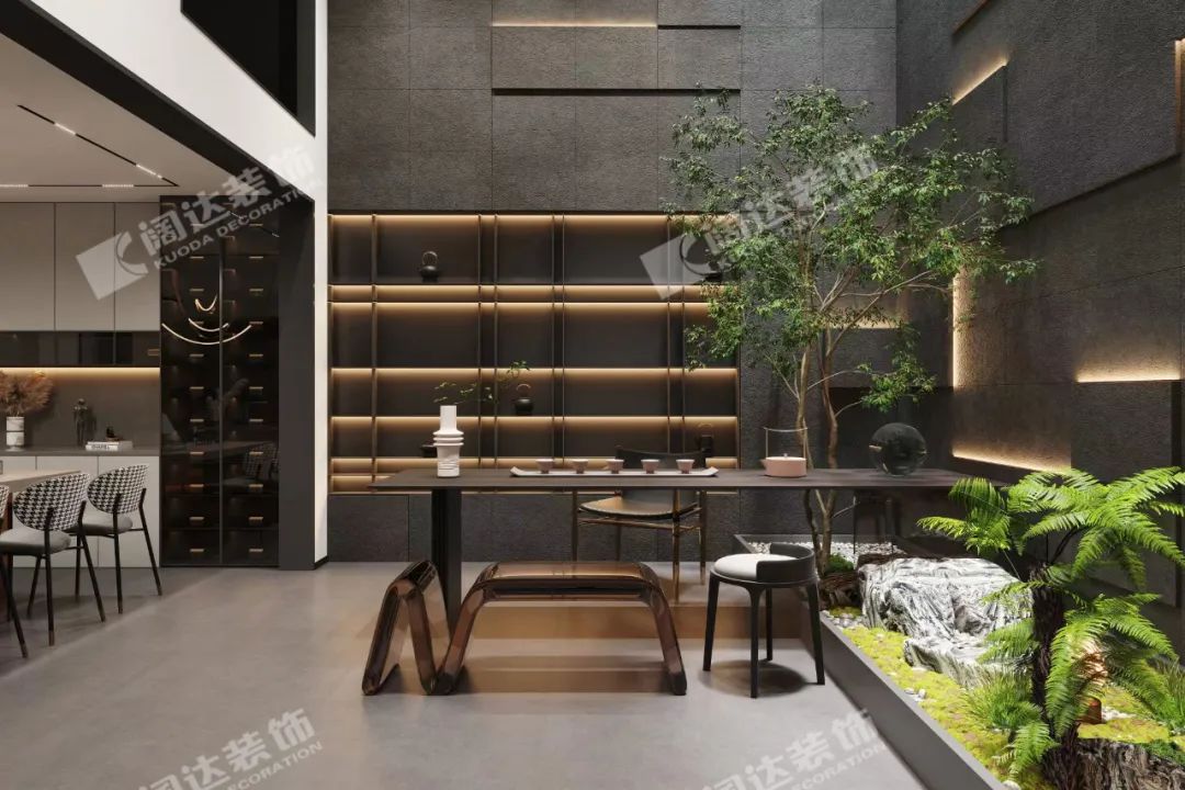 地下室茶室:設(shè)計,源于生活,更優(yōu)于生活。將自然與室內(nèi)結(jié)合,適當增加綠植,不僅增強了空間與自然的溝通和互動,也緩解了地下室相對閉塞的通病,有了細致與粗獷的反差,為生活增添一些新鮮感。