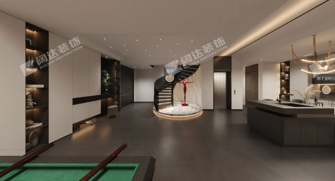 地下室入戶玄關(guān):從地下車庫進入室內(nèi),儲物柜與換鞋區(qū),被精心地設(shè)計成一處自然景觀,搭配星空頂,讓家更添藝術(shù)氣息與夢幻感,鋼結(jié)構(gòu)的旋轉(zhuǎn)樓梯也保證了地下室的通透性和呼吸度?!盎貧w本真安寧的生活,從家開始。”