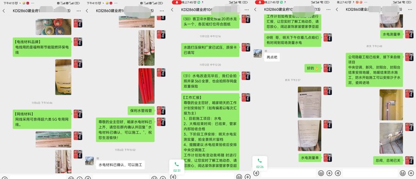 客戶、設計師、管家及水電師傅,現(xiàn)場確定水電位置,管家以文字加圖片形式發(fā)送至微信服務群,告知客戶今天交底的內(nèi)容,待客戶確認后方可施工。