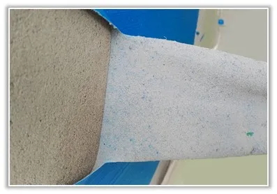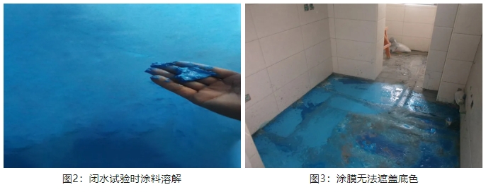 1、涂刷時要檢查基層是否存在起砂、疏松或大量的浮土、浮灰等現(xiàn)象,這些現(xiàn)象會導(dǎo)致防水層與基層的結(jié)合不穩(wěn)定,從而在閉水實(shí)驗(yàn)時容易引起防水層起鼓,涂膜與基層分離的現(xiàn)象(如圖1)。針對現(xiàn)場基層起砂、不牢固的問題,需先對基層涂刷界面劑或墻固,增強(qiáng)墻體基層的附著力,然后再涂刷防水涂料。